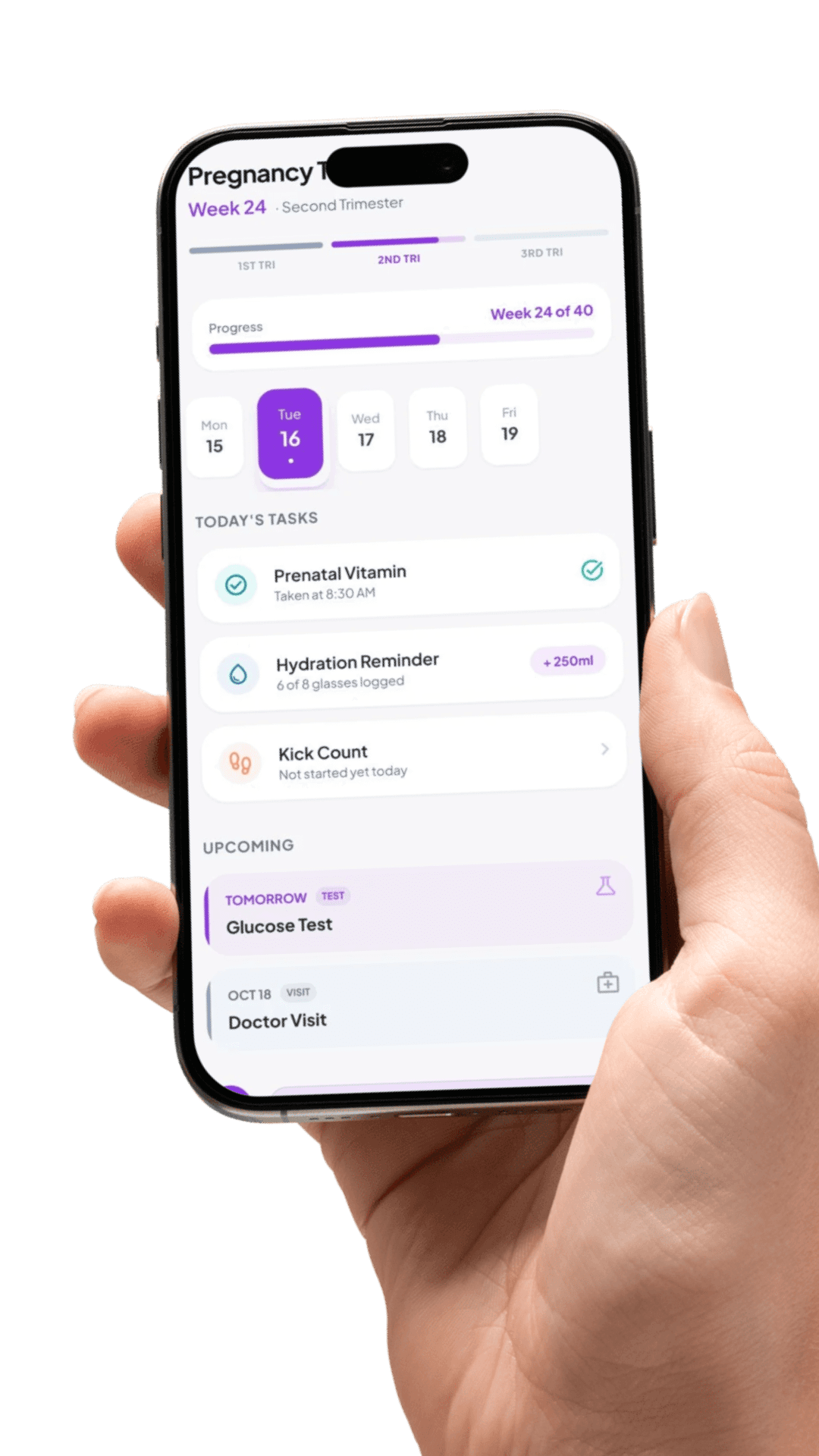 We organize your entire prenatal journey into simple daily actions — medications, meals, activity, and check-ups — all adapting to your trimester automatically.